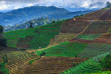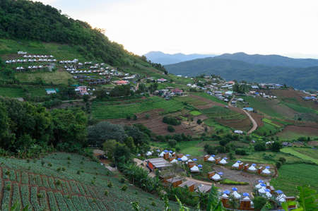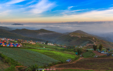 Beautiful landscape of Phu tub berk. agriculture village on the mountain with layer mountain and cloudy with sunset background.