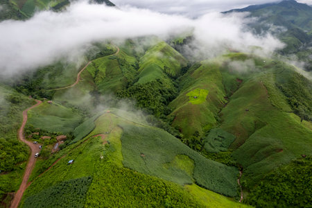 Landscape of Morning Mist with Mountain Layer. mountain ridge and clouds in rural jungle bush forest