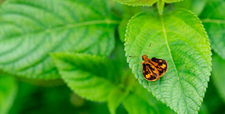 small orange butterfly perched on the weeds. Macro shot of a moth with orange and black color