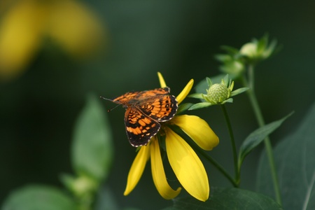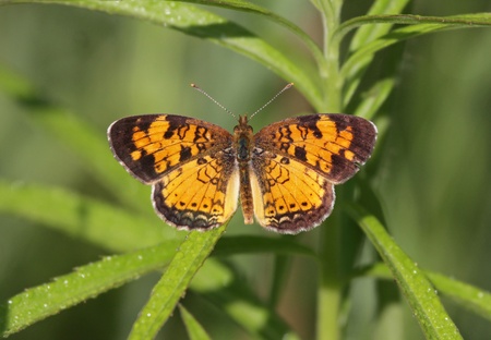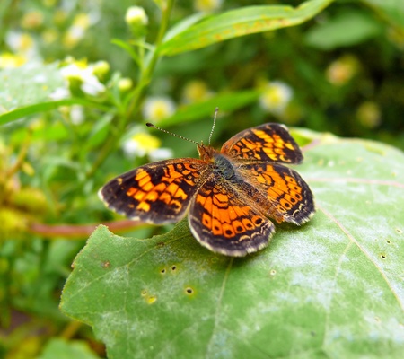 A Northern Crescent butterfly (Phyciodes cocyta) sitting on a weed. Shot in Cambridge, Ontario Canada.