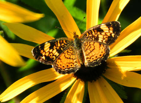 Northern crescent butterfly, Phyciodes cocyta, on goldenrod flowers at the Belding Wildlife Management Area in Vernon, Connecticut.