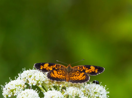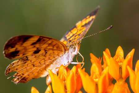 Pearl Crescent butterfly on a Butterfly Weed flower with flat wings and curled tongue
