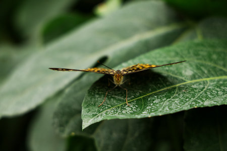 Endangered Scarce fritillary (Euphydryas maturna) resting on a fern