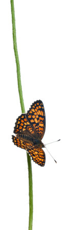 Knapweed Fritillary, Melitaea phoebe, on flower stem in front of white background