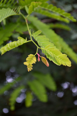 Close-up of a tamarind tree branch displaying its distinctive pinnate leaves and growing tamarind fruit pods