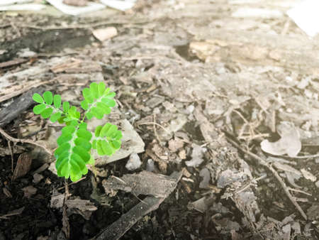 Small plant growing on dirty and dry ground with new hope to survive.