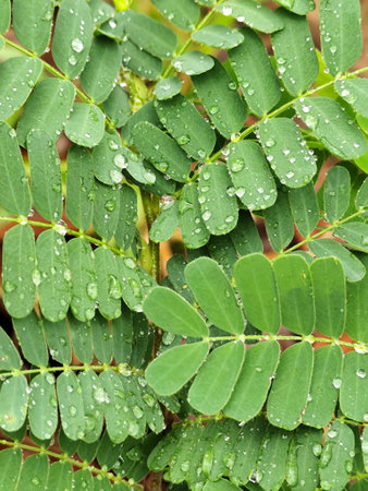 Close up of Tamarind leaves with water drops after the rain