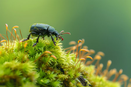 Miniature Beetle moss nature macro. Tropical green. Generate Ai
