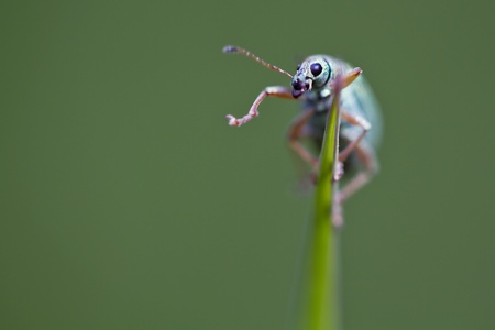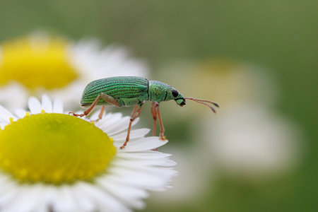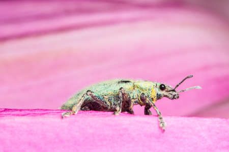 Macro photo of Green Immigrant Leaf Weevil insect on white flower