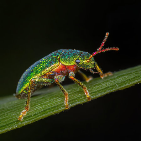 A detailed macro photograph captures the resilience of a tiny iridescent weevil.