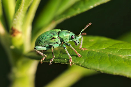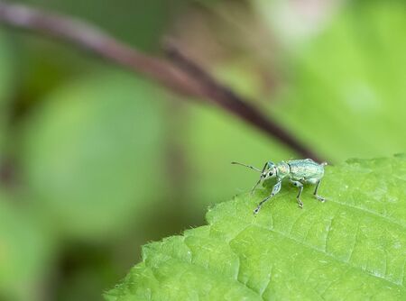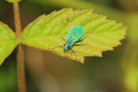 Common leaf weevil Phyllobius pyri snout beetle on plant eating leaf in garden. Cute little insect in wildlife
