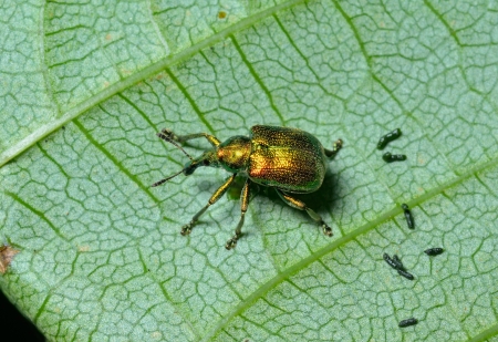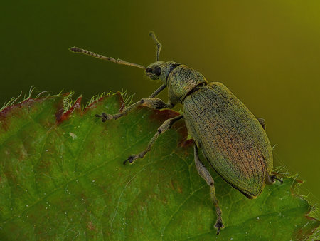 A small brown Curculionidae beetle crawls along the edge of a green leaf