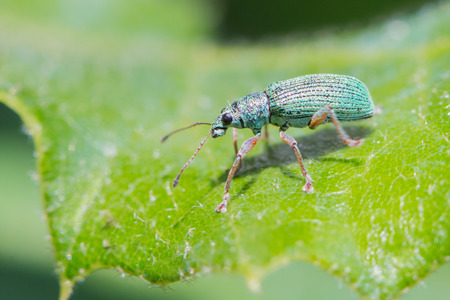 Beetle weevil (Otiorhynchus) eat green leaf. Close-up view of the insect