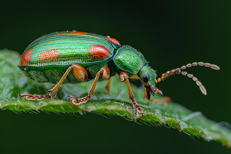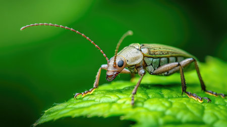 A macro shot of a bright green beetle with detailed textures on the leaves, showing its antennae and eyes