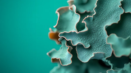 An extreme closeup reveals the delicate, ruffled edges of tealcolored lichen against a solid teal background.