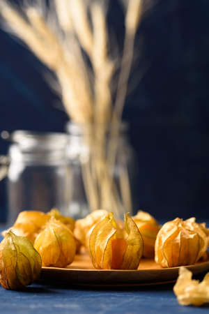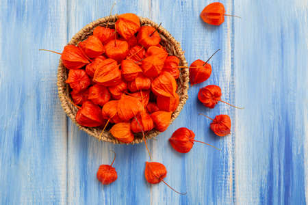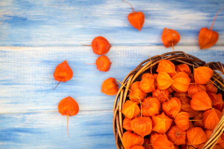 Autumn background. Bright orange physalis berries on a blue woody background. Background for the autumn holidays and thanksgiving day.
