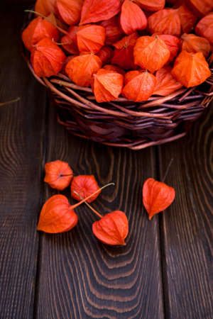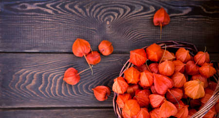 Autumn background. Bright orange physalis berries on a brown woody background. Background for the autumn holidays and thanksgiving day.