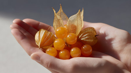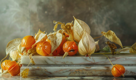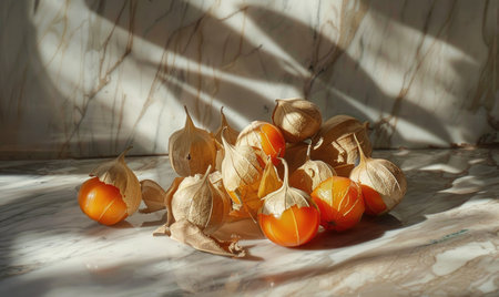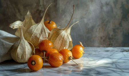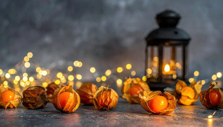 Winter cherry solanum fruits glowing under papery husks on slate small lantern effect refined seasonal botanical for editorial and serene backgrounds