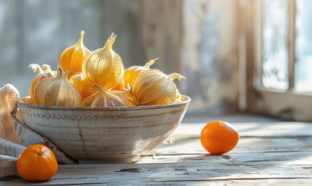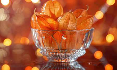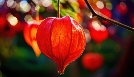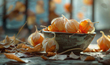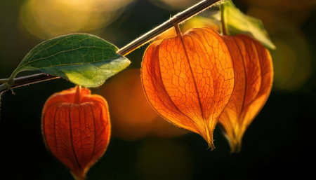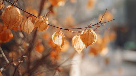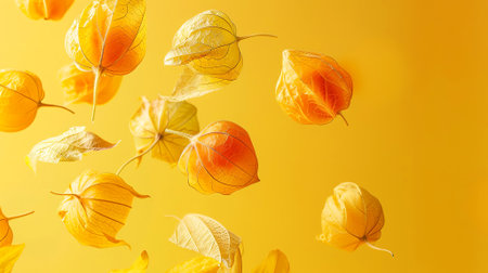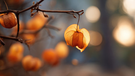 Delicate physalis lanterns float gracefully against a warm, golden backdrop, casting intricate shadows. This nature-inspired scene captures the essence of autumn. Generated A.I.