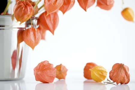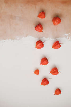 Physalis Alkekengi plant. Chinese lantern or ground berry. Authentic home decor in minimalist style.