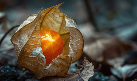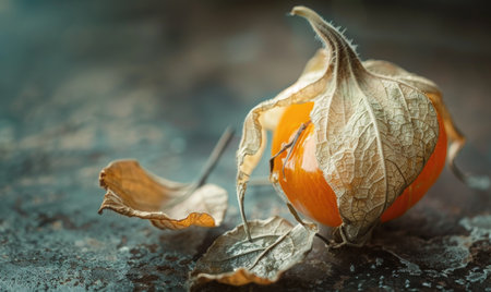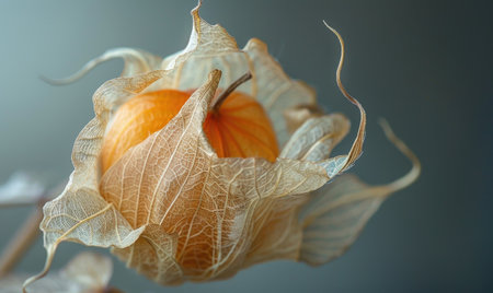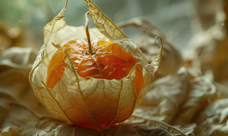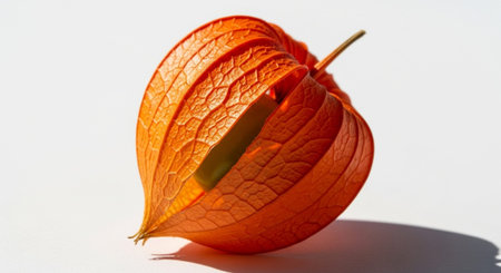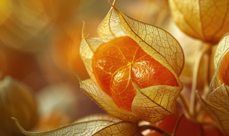 A captivating close-up of an orange lantern plant with intricate textures, beautifully highlighting its delicate structure and soft shadows in warm sunlight.