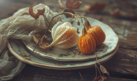 Physalis on a vintage plate, with a cloth napkin, soft focus