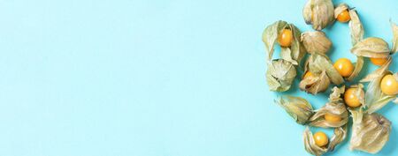 Physalis fruit with husk on blue background. Top view. Copy space. Tropical travel, exotic fruit. Vegan and vegetarian concept. Physalis Peruviana fruit.