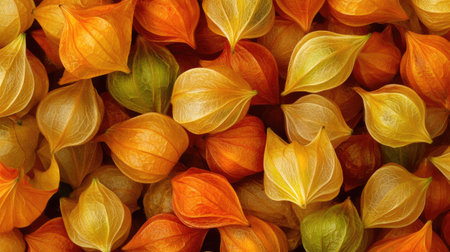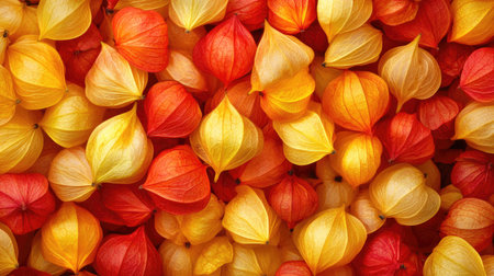 A colorful pattern of Physalis berries, with selective focus on the golden, husk-covered fruit, ideal for food-related backgrounds or culinary promotions.