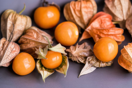 Physalis fruits -Physalis Peruviana- with skin on gray background, close up
