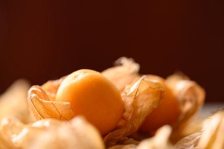 Group of Physalis plant fruits with the berry enclosed in the shell. Macro photo.