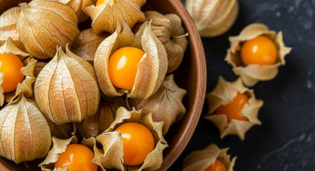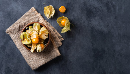 fresh yellow physalis in wooden bowl on dark background. top view and copy space