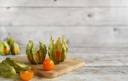 Ripe healthy physalis (orange golden, gooseberry), over wooden board on a wooden background, copy space