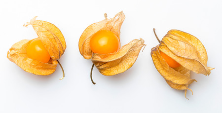 Flowers and fruits of Fisalis (Physalis peruviana) isolated on white background. Viewed from above.