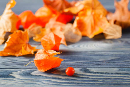 Autumn simbols, Phisalys on the blue wood background