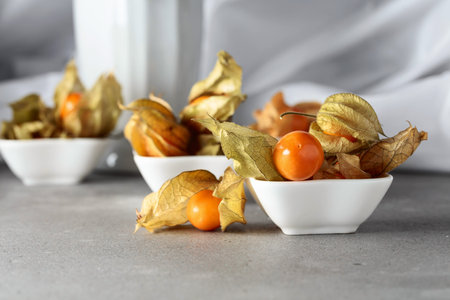 Fresh juicy physalis in a white dish on a grey table.