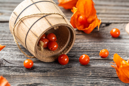 Physalis or Chinese lantern fruit decorated on a wooden table