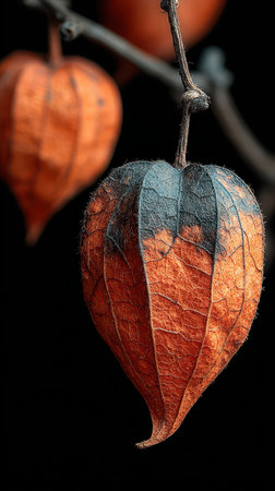 Winter cherry solanum fruits glowing under papery husks on slate small lantern effect refined seasonal botanical for editorial and serene backgrounds