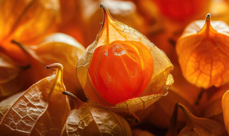A captivating close-up of an orange lantern plant with intricate textures, beautifully highlighting its delicate structure and soft shadows in warm sunlight.
