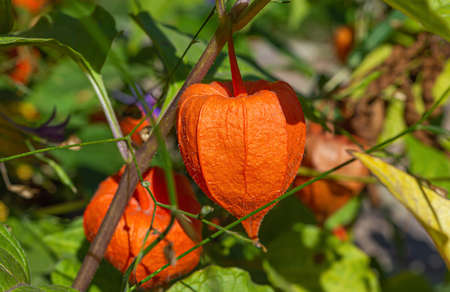 Physalis or Chinese Lantern plant in summer garden.