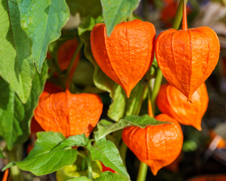 Chinese lantern plant growing outside with colorful calyces and green leaves