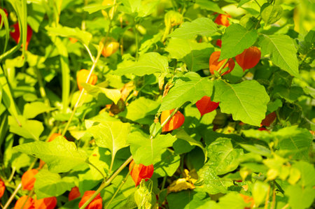 orange lanterns of physalis alkekengi among green leaves