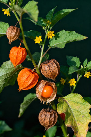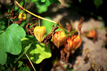Physalis plant with ripe fruits in dry calyxes.