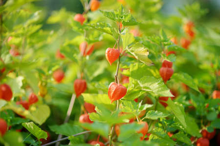Bright orange lantern-shaped flowers of physalis on sunny summer day. Winter cherry branch outdoors. Beauty in nature.