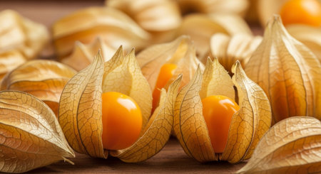Ripe physalis on rustic wood surface with natural lighting