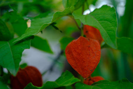 Physalis - orange lanterns of physalis alkekengi among green leaves