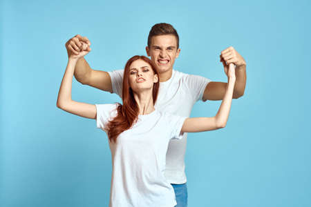 couple of girl and man with naked back in underwear pants on blue background, passion and couple in love, foreplay and seduction, tenderness and affection, bisexual