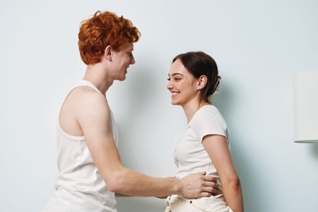 Young couple smiling and embracing indoors, man and woman facing each other with happy expressions in casual white clothing against plain background in romantic moment.
