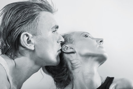 Sensual couple on sky background. We need to live with passion. Passionate couple concept. Vibrant with passion. A passion for latin man body. Sensual couple on sky background.