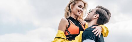 panoramic shot of attractive and blonde woman and handsome man hugging on roof