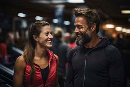 Athletic duo enjoying a lighthearted moment while exercising outdoors in a park setting, showcasing genuine connection, fitness lifestyle and natural camaraderie.